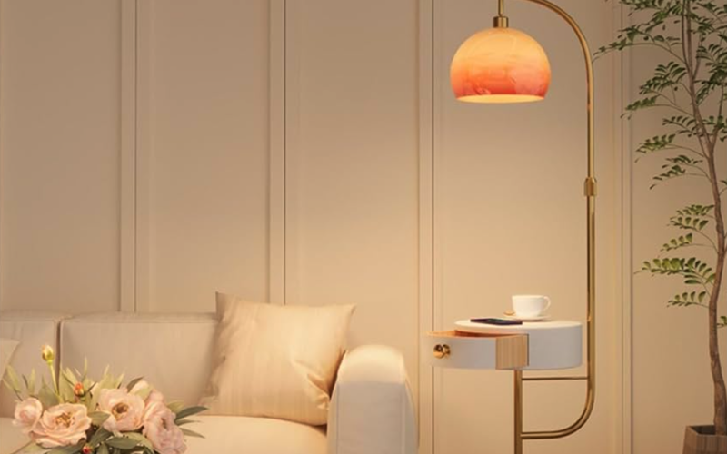 De Elegante Caramel Boogvormige Bijzettafel Vloerlamp is een opvallend meubelstuk dat niet alleen functioneel is, maar ook een statement maakt...